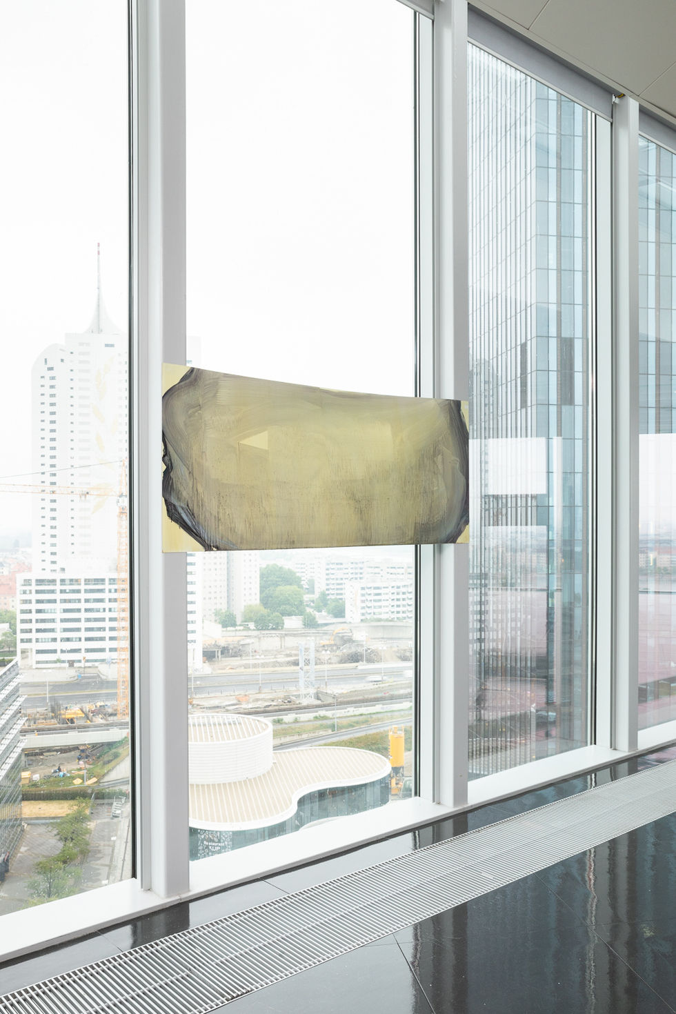 Der Ausstellungstitel Magnetic Fields bezieht sich auf die An- und Abstoßungskräfte, die auf diese Weise entstehen. Für einen Teil der Arbeiten benutzt Saile mit Magnetfolie ein neues und für die malerische Praxis ungewohntes Material, das industriell hergestellt ist und durch seine Beschichtung bereits eine Art weiße Grundierung besitzt, auf die die Farbe direkt aufgetragen werden kann. Aufgrund seines magnetischen Anziehungspotentials und seiner Biegsamkeit kann es eine direkte Beziehung mit den Metallelementen der Architektur eingehen, wie etwa Säulen oder Fensterrahmungen. Durch die Einbeziehung dieser kuratorischen „Nichtorte“ werden die spezifischen Gegebenheiten der Architektur sichtbar gemacht. Auf diese Weise inszeniert Saile eine Blicksituation, die das Ausstellungsgefüge über die großen Fensterflächen mit dem Außenraum der Stadt Wien verbindet.